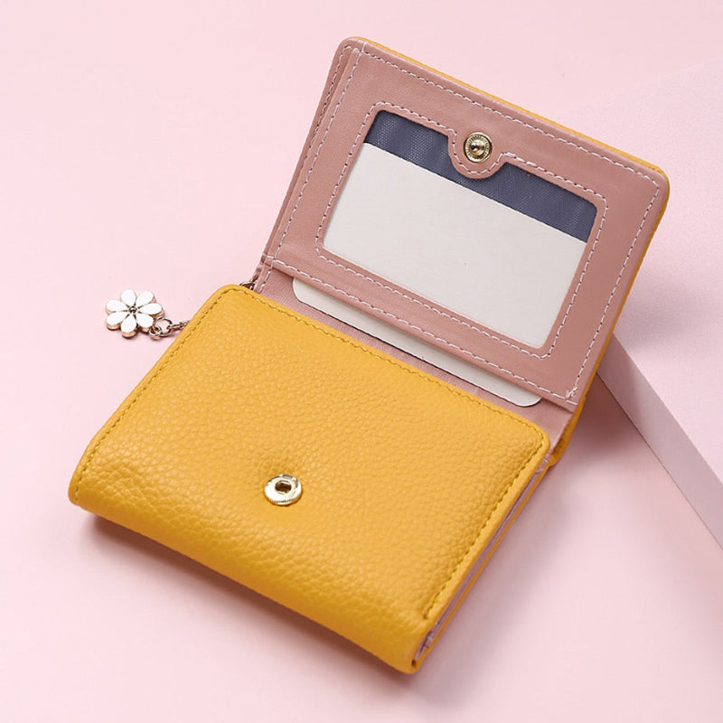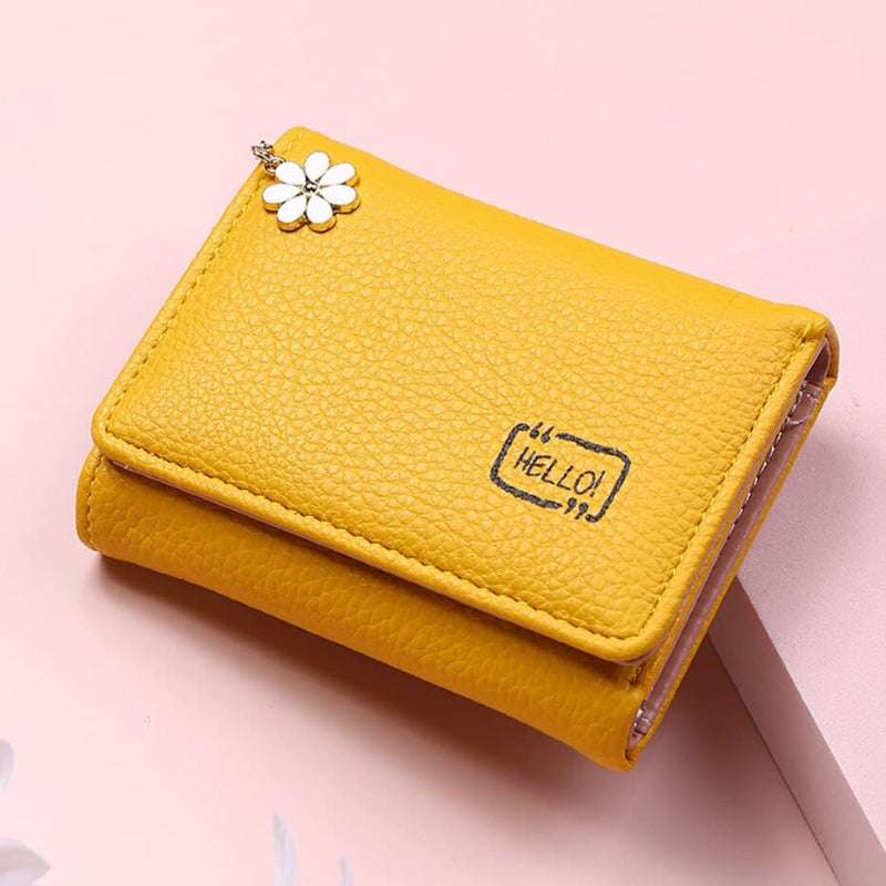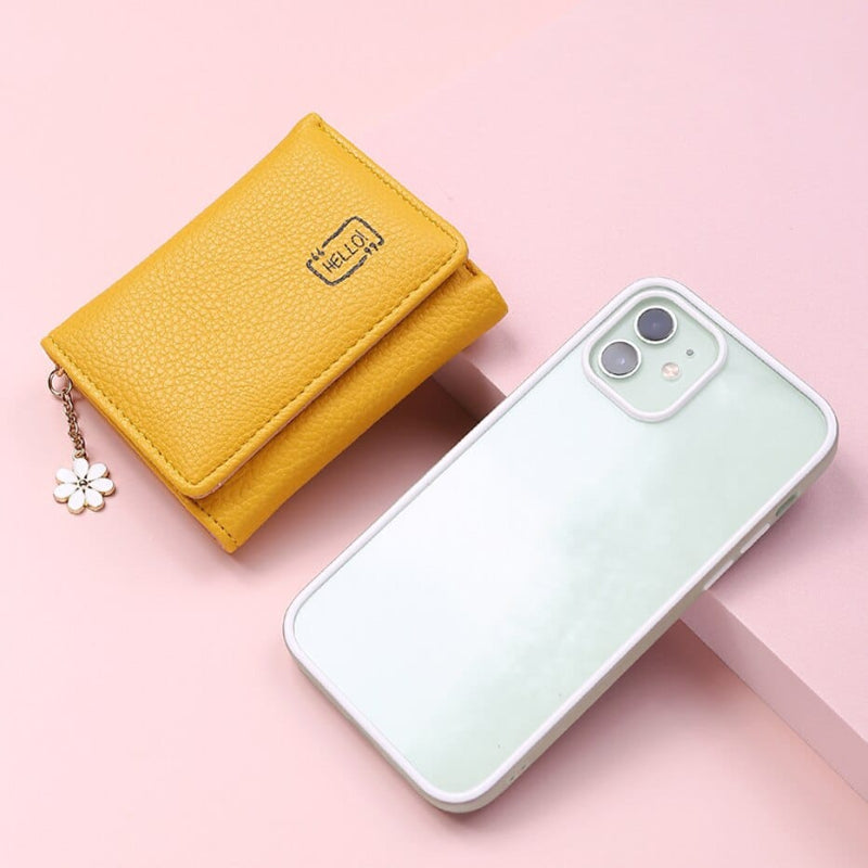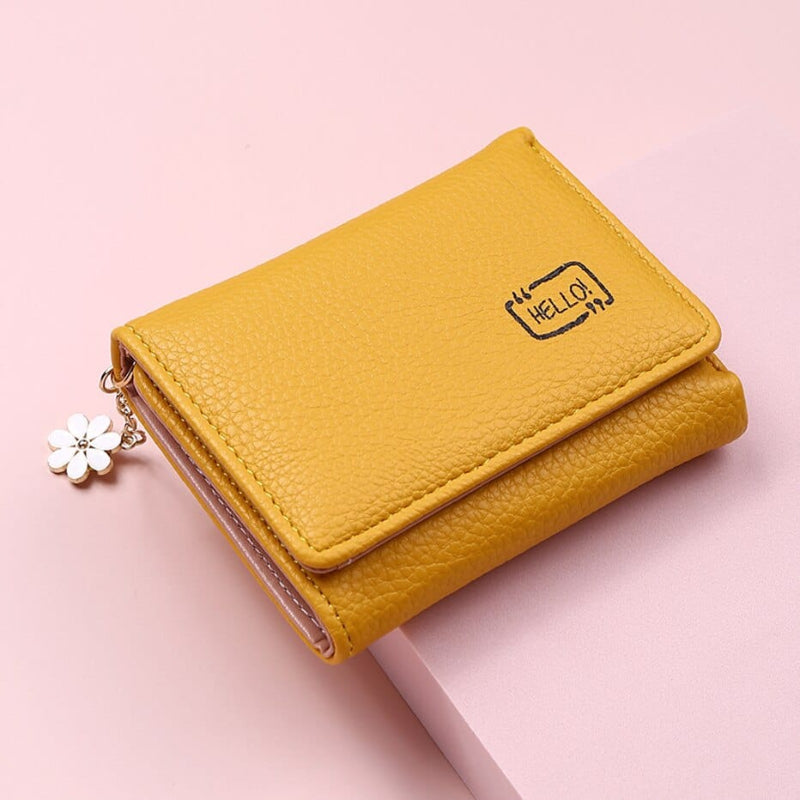 El amarillo brillante de este monedero contrasta con el suave colgante blanco en forma de flor de margarita. Esta cartera muy compacta aportará practicidad con sus múltiples bolsillos interiores y color a tu día con su alegre tono amarillo sol.