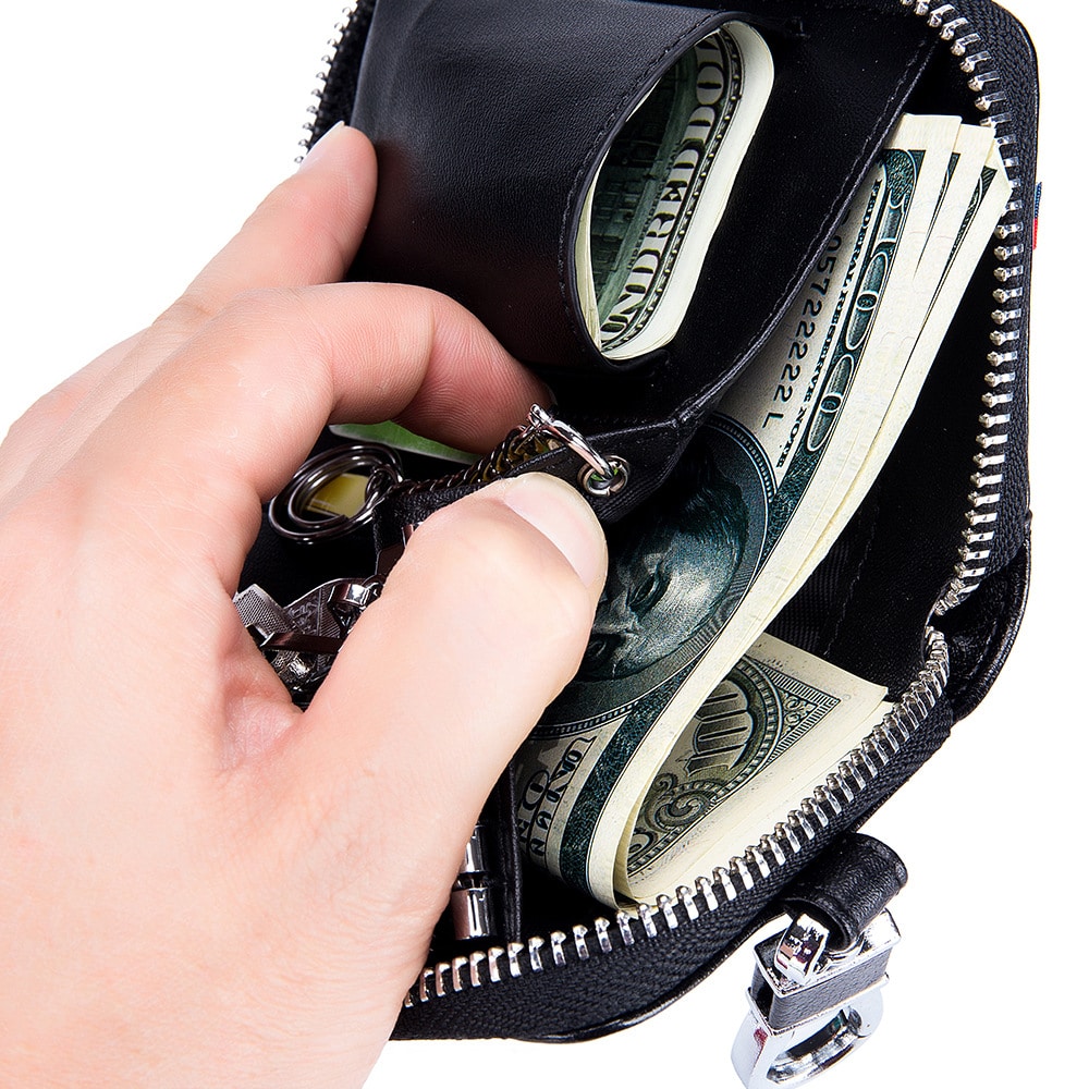 Este monedero dispone de 2 ranuras para tarjetas, 2 grandes bolsillos para billetes y monedas, 6 pequeños llaveros integrados y un llavero exterior. Con su cierre de cremallera y su pequeña correa que se sujeta fácilmente al pantalón, ofrece la máxima protección para sus pertenencias, sin dejar de ser práctica y fácil de usar: ¡no deje nada al azar! Elija este monedero para hombre y aprovéchese de su solución de almacenamiento.