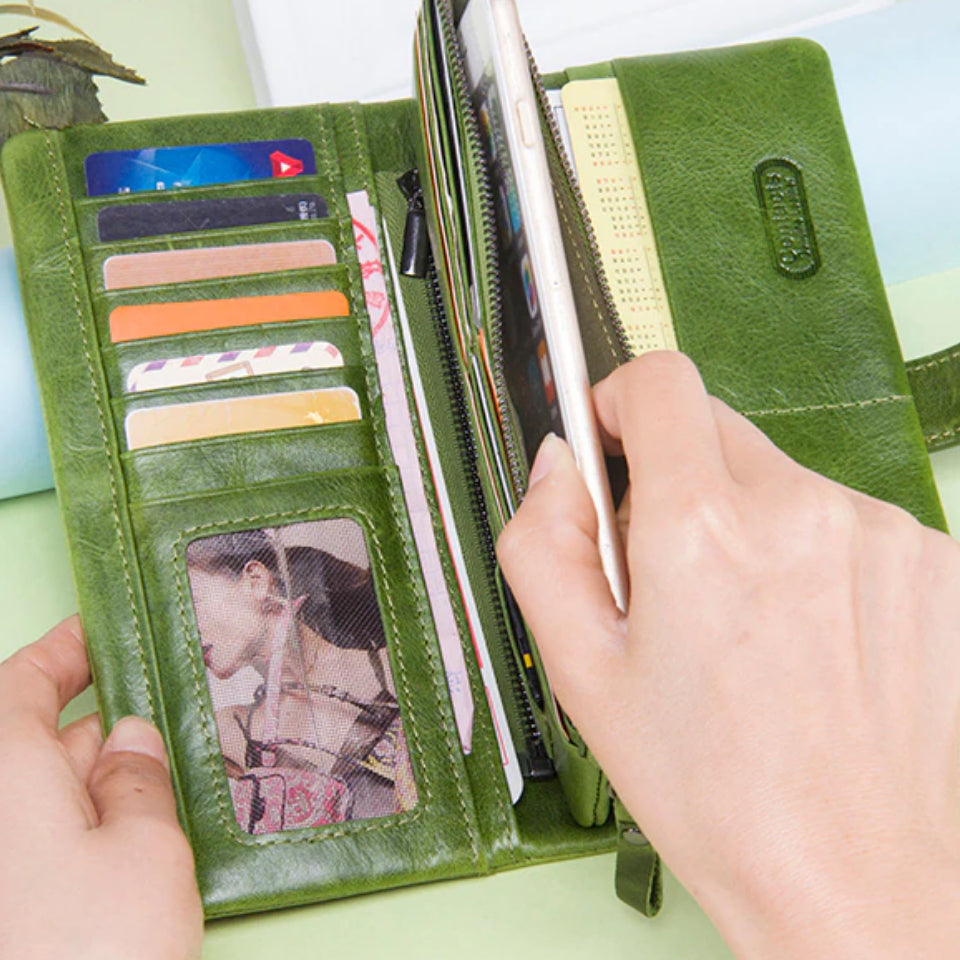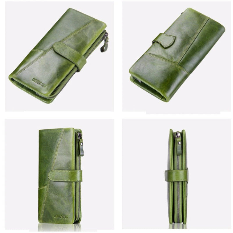 Este Monedero Verde será el accesorio ideal para transportar todos sus efectos personales, manteniéndolos perfectamente protegidos gracias a su resistente material de piel de vacuno y su cierre a presión para un cierre seguro en cualquier circunstancia.